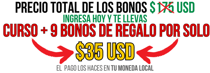 Todos los bonos que visualizas en esta página, por separado tienen un costo, pero al inscribirte, los tendrás todos de forma gratuita.