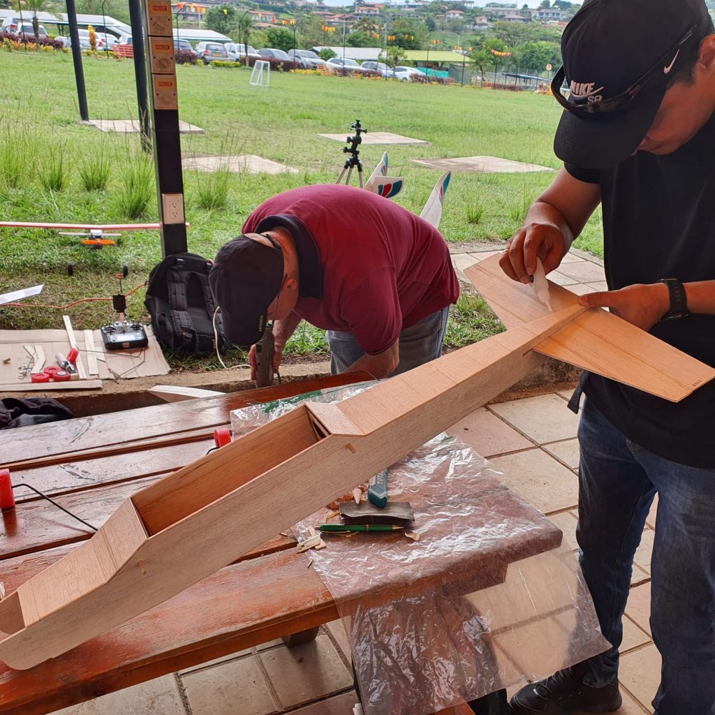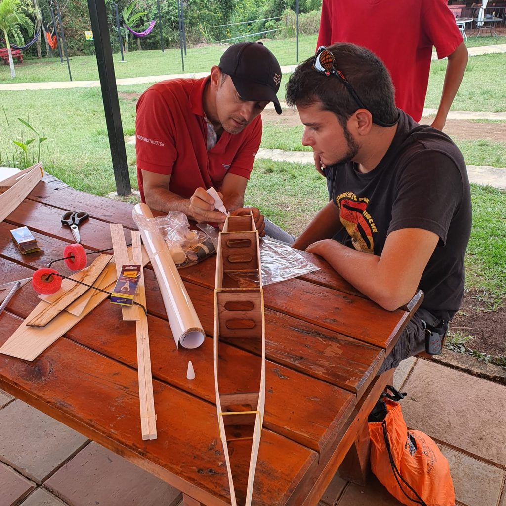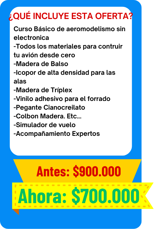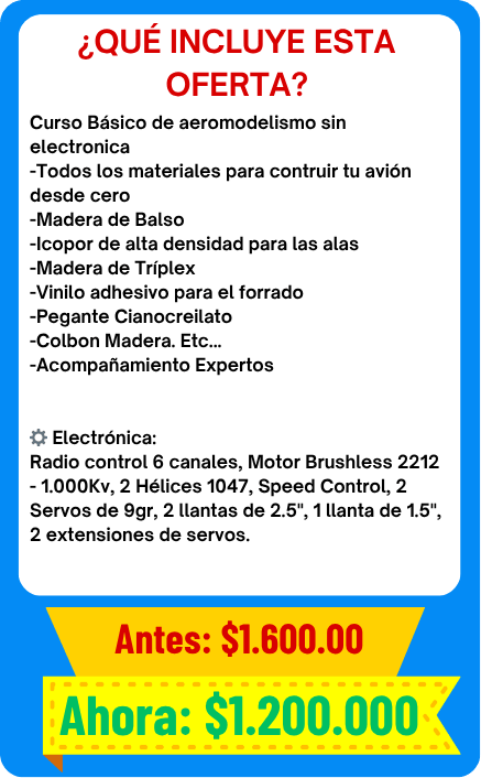 Incluye materiales para la construcción del avión RC, (madera balsa, cuadernas, bigas, bayonetas, tren de aterrizaje, ruedas y vinilo blanco)